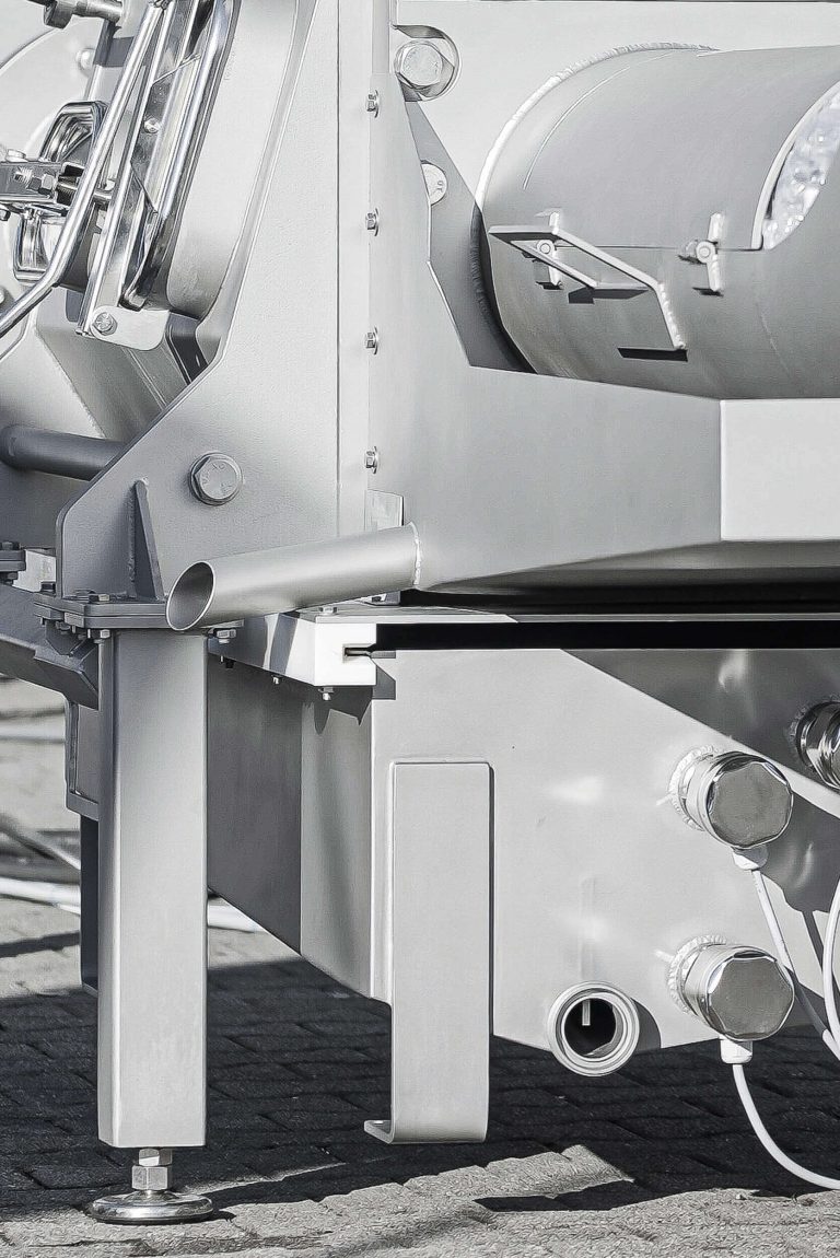 Der Einfülltrichter, in den das zu entwässernde Material entweder manuell, über ein Förderband oder mithilfe einer Hebekippvorrichtung aufgegeben wird, bietet mit einem Fassungsvermögen von 1.000 l ein besonders großes Puffervolumen. Damit steht ausreichend Reservekapazität zur Verfügung, um auch bei schwankender Materialzufuhr einen kontinuierlichen Prozess sicherzustellen. Für die G.300 Duo Hygienic Design bieten wir auch einen Trichter mit 2.000 l Volumen an.