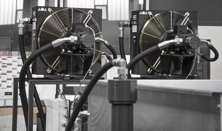 To compensate for temperature differences in the hydraulic oil, the briquetting presses can be equipped with a special hydraulic oil cooling system (air or water cooling). This ensures that the maximum operating temperature of the oil of 75°C is not exceeded even during uninterrupted three-shift operation. A safety switch automatically switches off the hydraulic systems in the event of overheating to prevent damage.