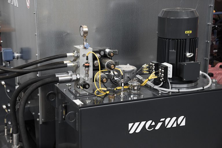 The hydraulic unit has a separate oil tank with pump motor and complete valve control. The compact design right next to the material hopper makes the entire briquetting press extremely space-saving and efficient in design.