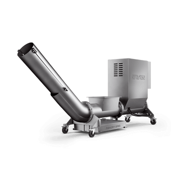WEIMA label presses achieve an increased discharge height due to the inclined discharge pipe. This allows the pressed products to be discharged directly into a tipping trough without using a conveyor belt. Depending on the space requirements, different versions with discharge to the left or right can be configured. The system can thus be seamlessly integrated into your production line.