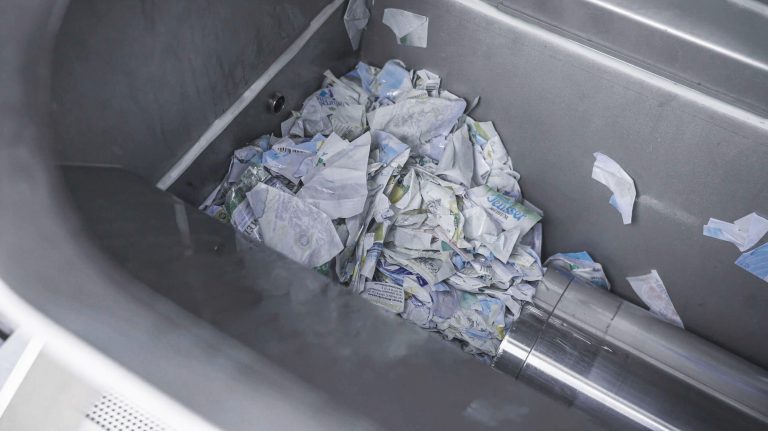 Our hydraulic drainage presses dispose of old labels in bottling facilities efficiently and economically. The WEIMA A.300 produces pressed labels with an output diameter of 300 mm. Discharged labels are first picked up by the label press, then pressed and finally transported drip-free into a container. A hydraulic cylinder reduces the volume of the unpressed labels by approx. 70%, the residual moisture is then approx. 30%. The pressed out lye is collected and can be returned to the cleaning machine.