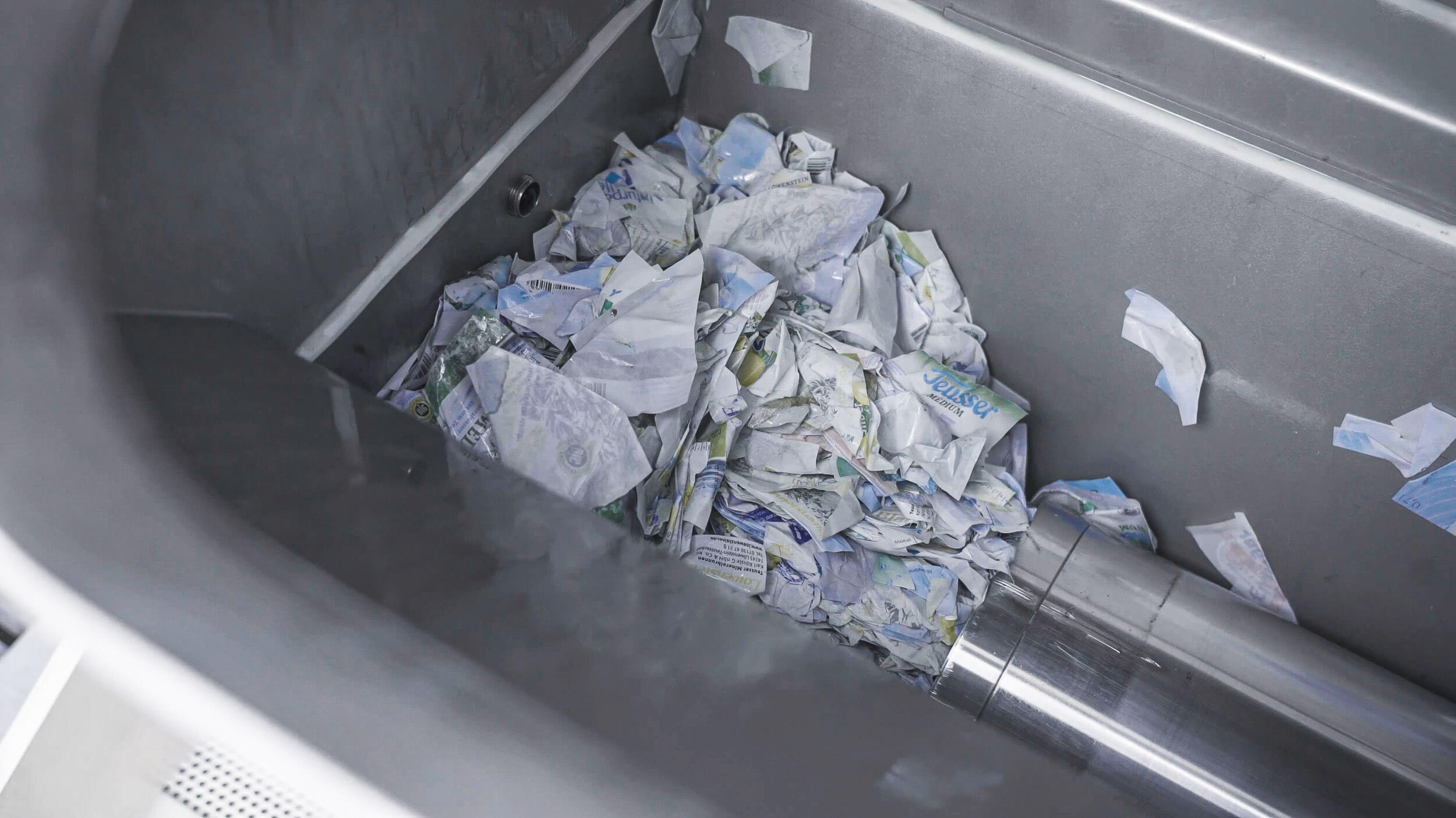 In beverage bottling plants, the removal of bottle labels generates large quantities of heavily saturated waste labels that contain not only water but also residual lye from the washing process. This mixture is heavy, dripping and results in high disposal and cleaning costs.