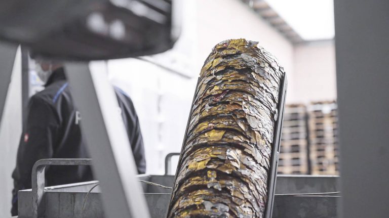 The discs are formed by the press cylinder, which presses the material against the previously produced discs, which are still in the discharge pipe. The angled bend of the discharge pipe generates enough counterpressure to strongly compact and drain the material. In addition, the wedge position of the discharge pipe can be used to set subsequent recompaction.