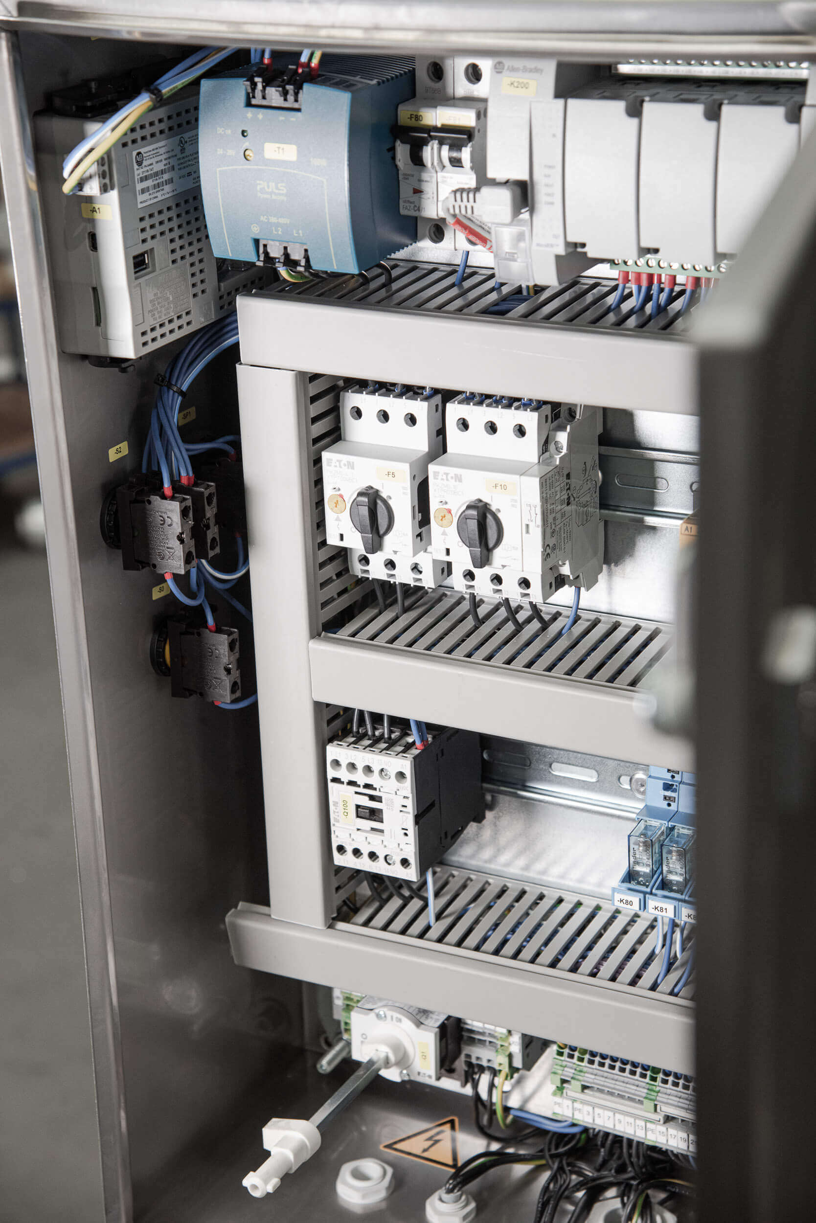 The integrated PLC control system is precisely tailored to the dewatering process and ensures reliable operation. Key parameters such as pressing force and cycle time are preset at the factory but can be flexibly adjusted to suit the specific application at any time. Depending on requirements, the system can be operated in manual or automatic mode. Only high-quality branded components from renowned manufacturers such as Siemens, Allen Bradley and Rittal are used.