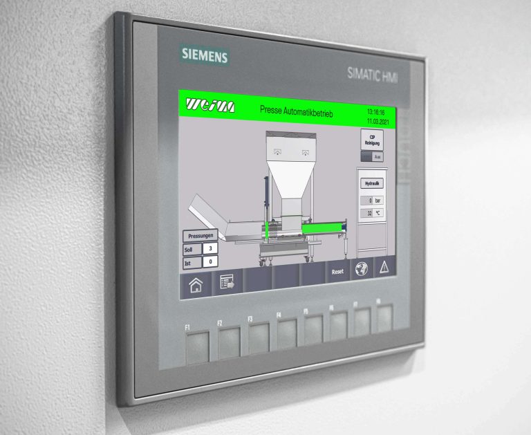 The Siemens control system with touch display allows intuitive setting of parameters such as the press force and time or the repress function. Precise diagnostic messages ensure minimal downtime. In addition, complete networking in the PROFINET system is possible. In this way, upstream and downstream systems such as conveyor belts or a lifting and tilting station can be controlled in a user-friendly manner.