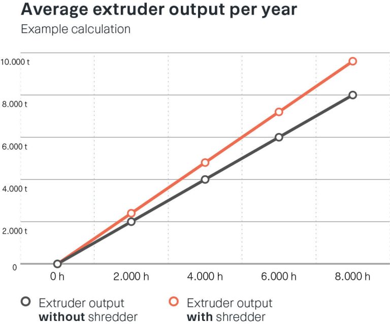 While the average extruder output without a shredder is 1.000 kg per hour, it can be increased to at least 1.200 kg per hour with shredding technology.