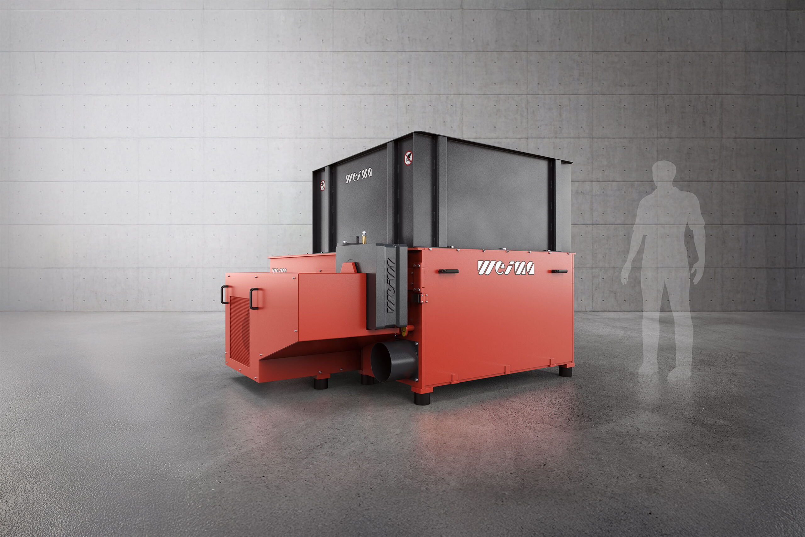 The contoured V-rotor, featuring two rows of cutting blades, optimises material intake and ensures high throughput rates whilst reducing energy consumption. The curved rotor geometry improves the feed of bulky wood and paper waste and reduces thermal stress in the cutting zone, thereby increasing efficiency during continuous operation.