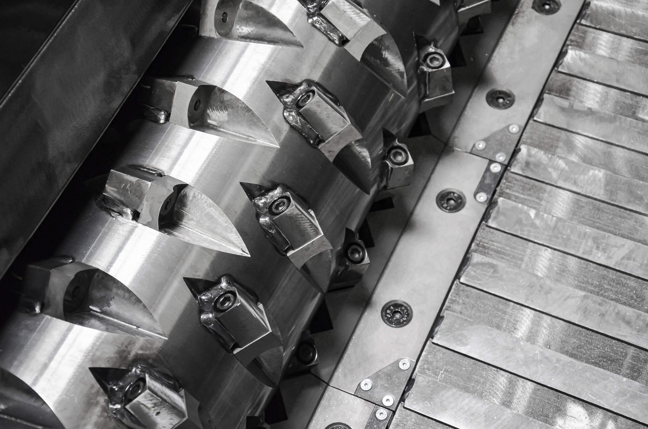The F-rotor really comes into its own when processing flexible materials such as filaments, films or veneer. Its controlled feed behaviour, combined with precise cutting geometry, enables a powerful cut. This ensures high material throughput. The blade holders are firmly welded to the solid-material rotor. Cutting blades with edge lengths of 30 or 40 mm are also reversible.