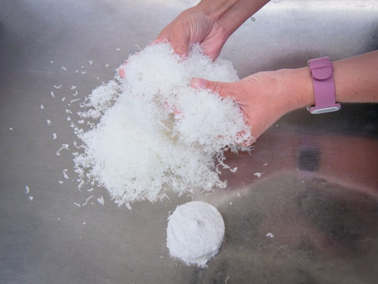 A collection of loose optical swarf is shown with a briquette next to it for space comparison.