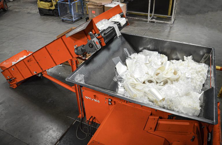 Waste forms at various points within the production line. For example, it can accumulate in the form of plastic lumps at the beginning and end of extrusion lines (ex. cast film extrusion). In addition, there are roll remnants that remain on the metal core. These are folded into so-called blankets and can also be processed using an in-house recycling line.