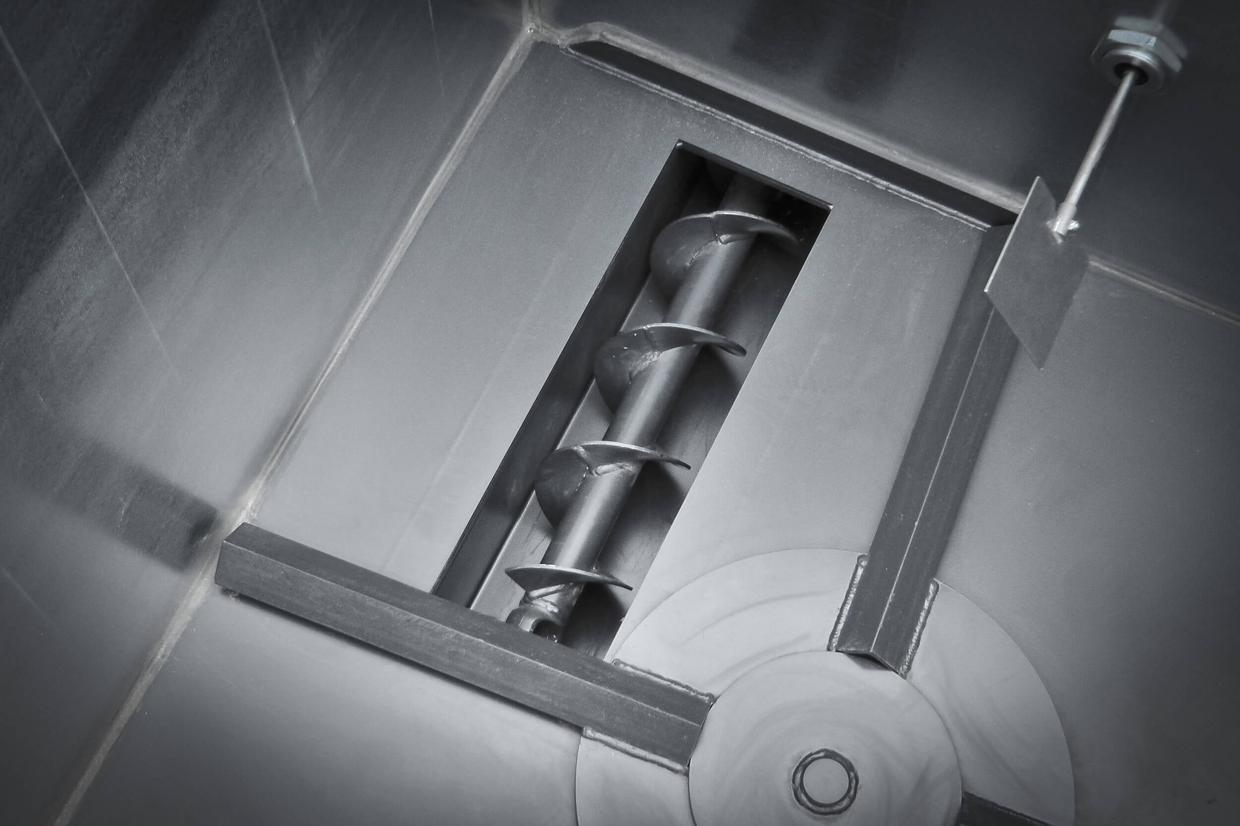 The agitator fitted to the bottom of the feed hopper ensures a constant supply of material to the screw conveyor. The continuous mixing of the material also prevents bridging and breaks up lumps.