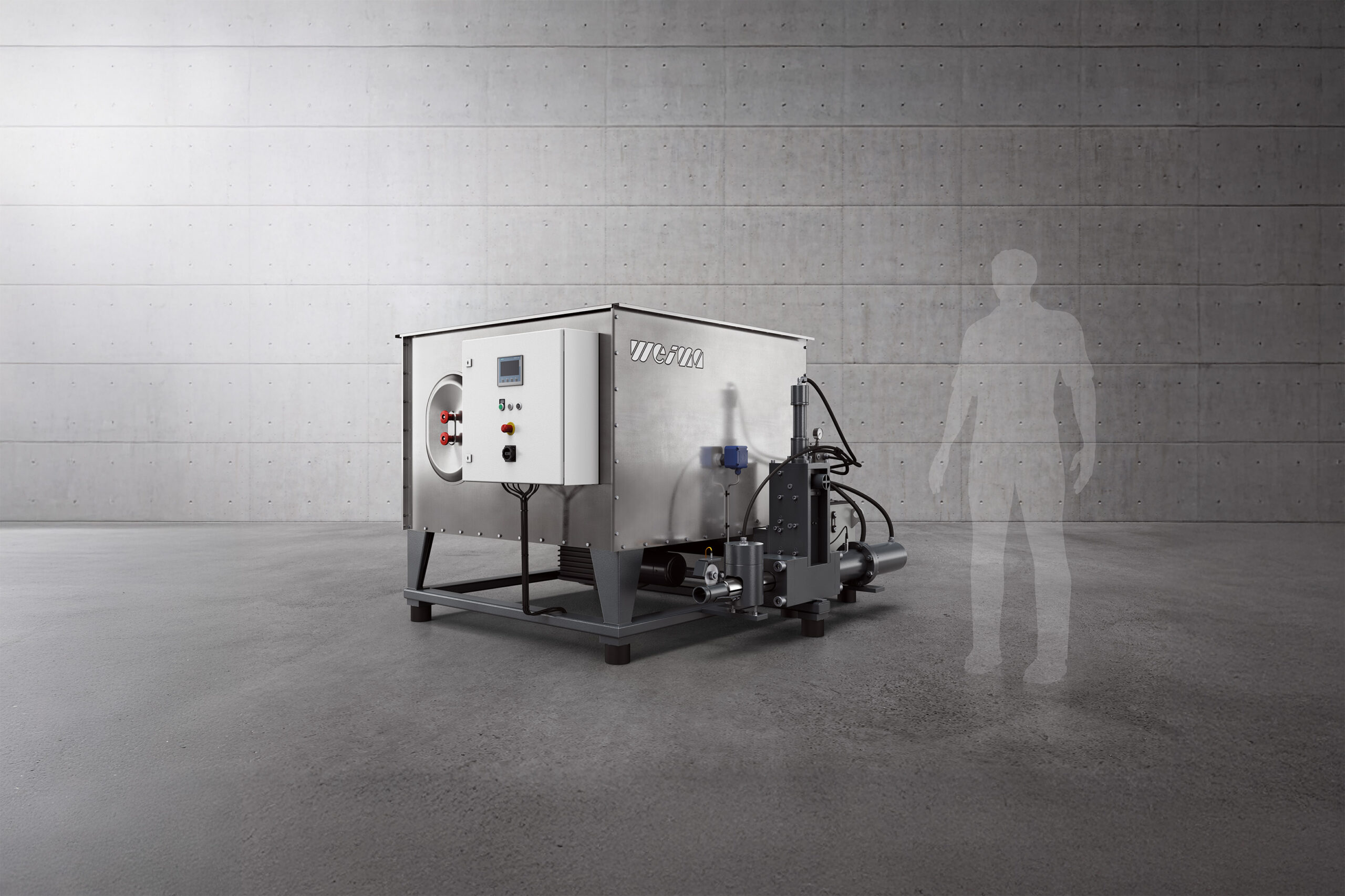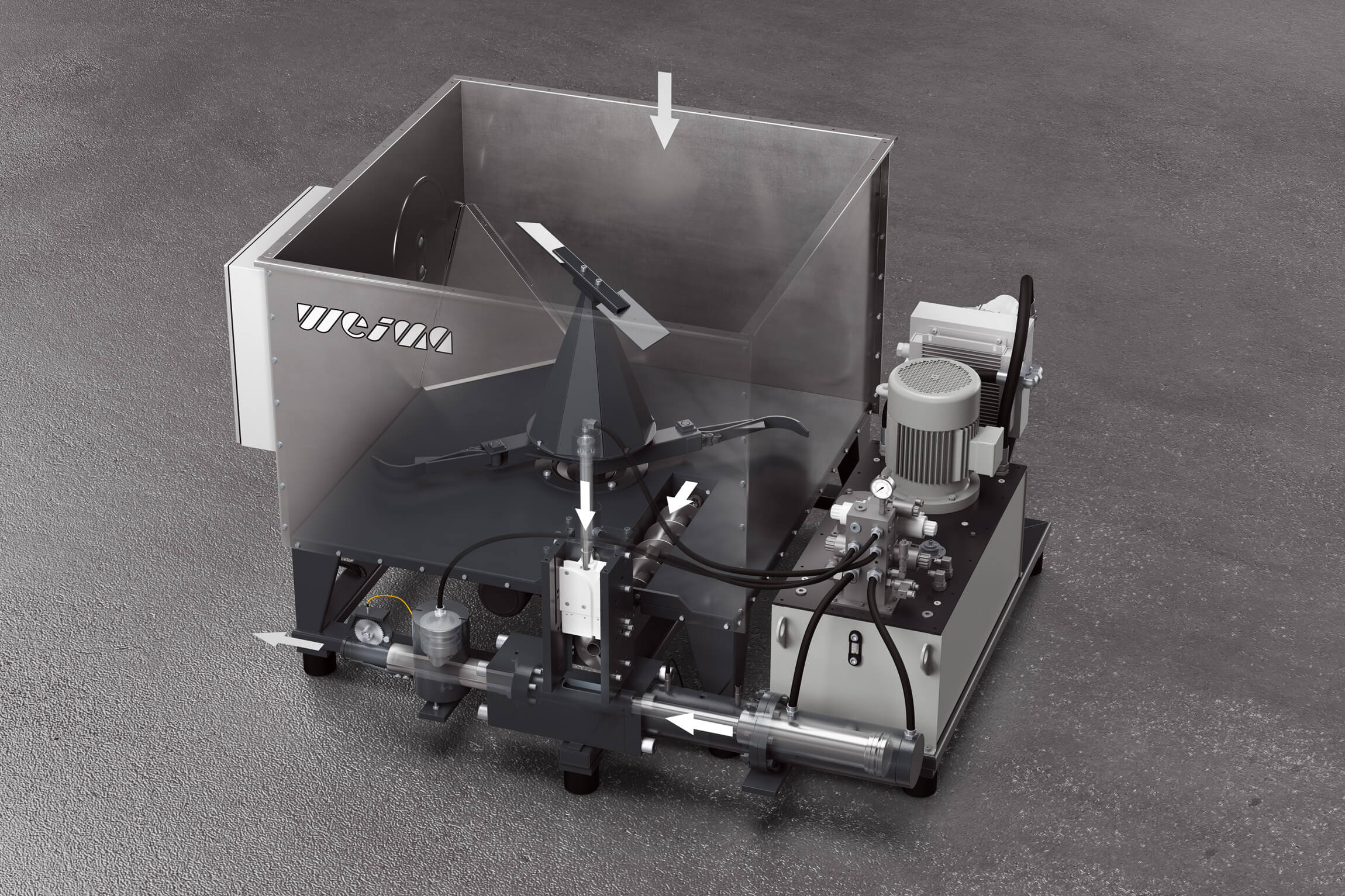 The hydraulic system is designed to be space-saving whilst being engineered for stable operating conditions. The unit features a separate oil tank, pump motor and a complete valve control system, all arranged compactly directly adjacent to the material hopper. Temperature monitoring ensures controlled operation over long periods of use. For the user, this means efficient machine integration combined with a clear and straightforward system layout.