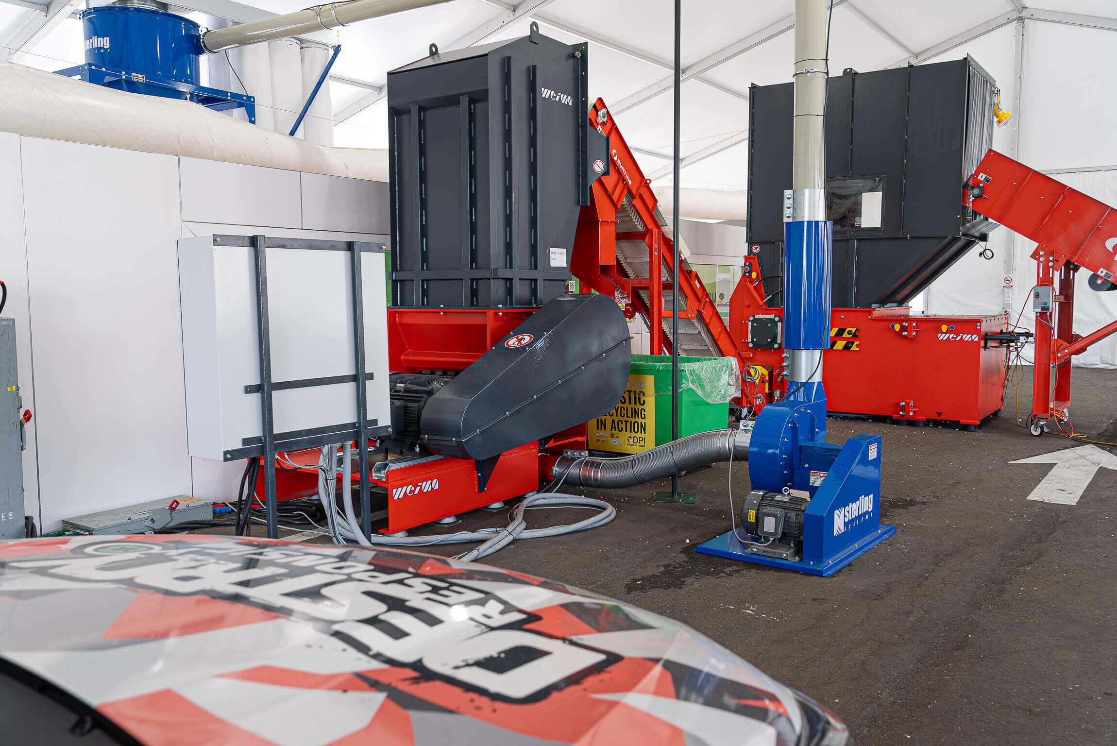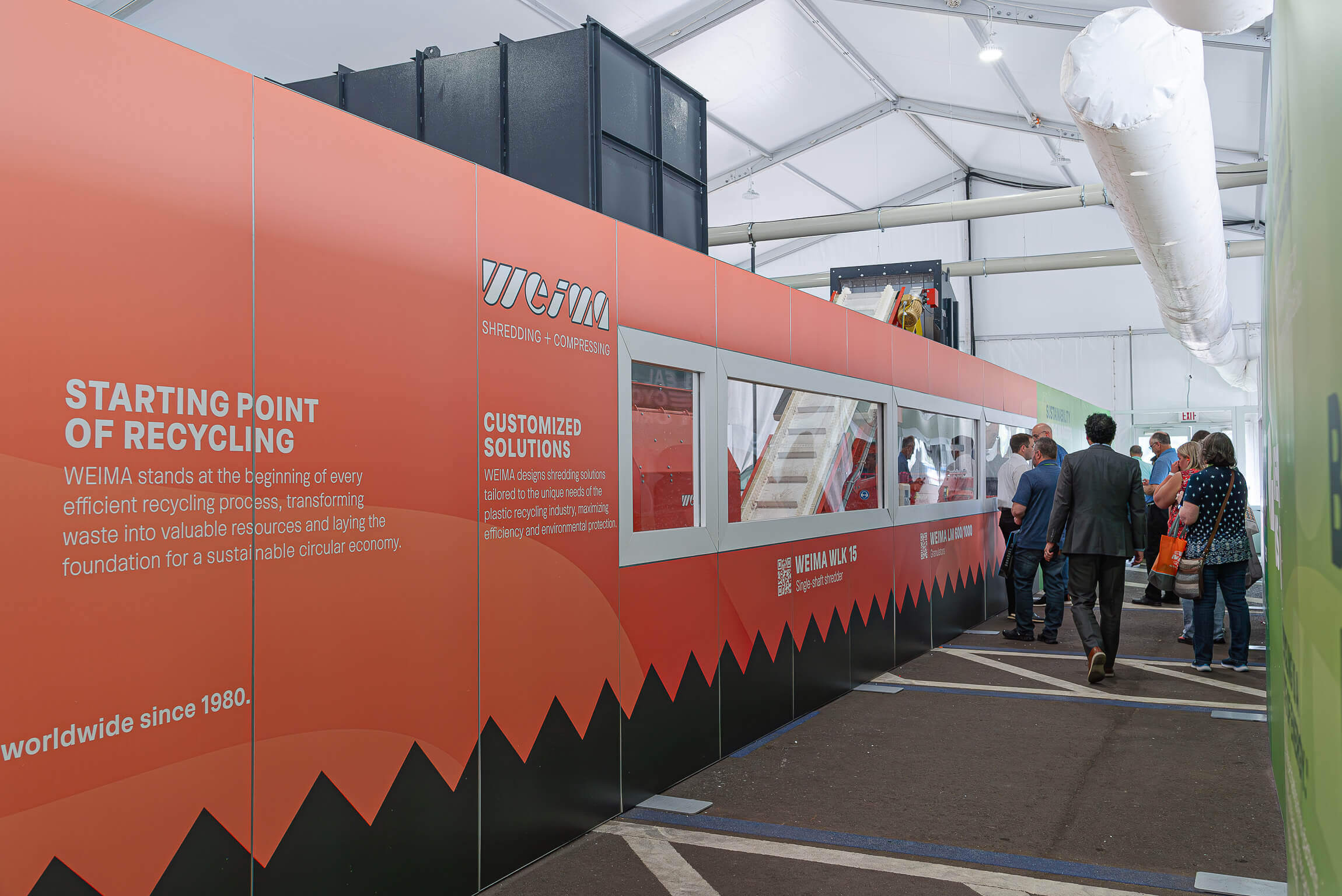 The PLASTICS team (formerly The Society of Plastics Industry) got wind of the Destroy Responsibly program and approached WEIMA about altering it a bit to fit the plastics industry. A two-stage plastics shredding system was assembled in the parking lot behind the tradeshow and plastic scrap that was created during the show was brought out back. The two-stage system consisted of a WLK13 single-shaft shredder, an LM granulator, conveyors and an air system. Commercial Plastics Recycling (CPR) out of Tampa, Florida, transported, washed, and reintegrated the regrind into the plastics market.