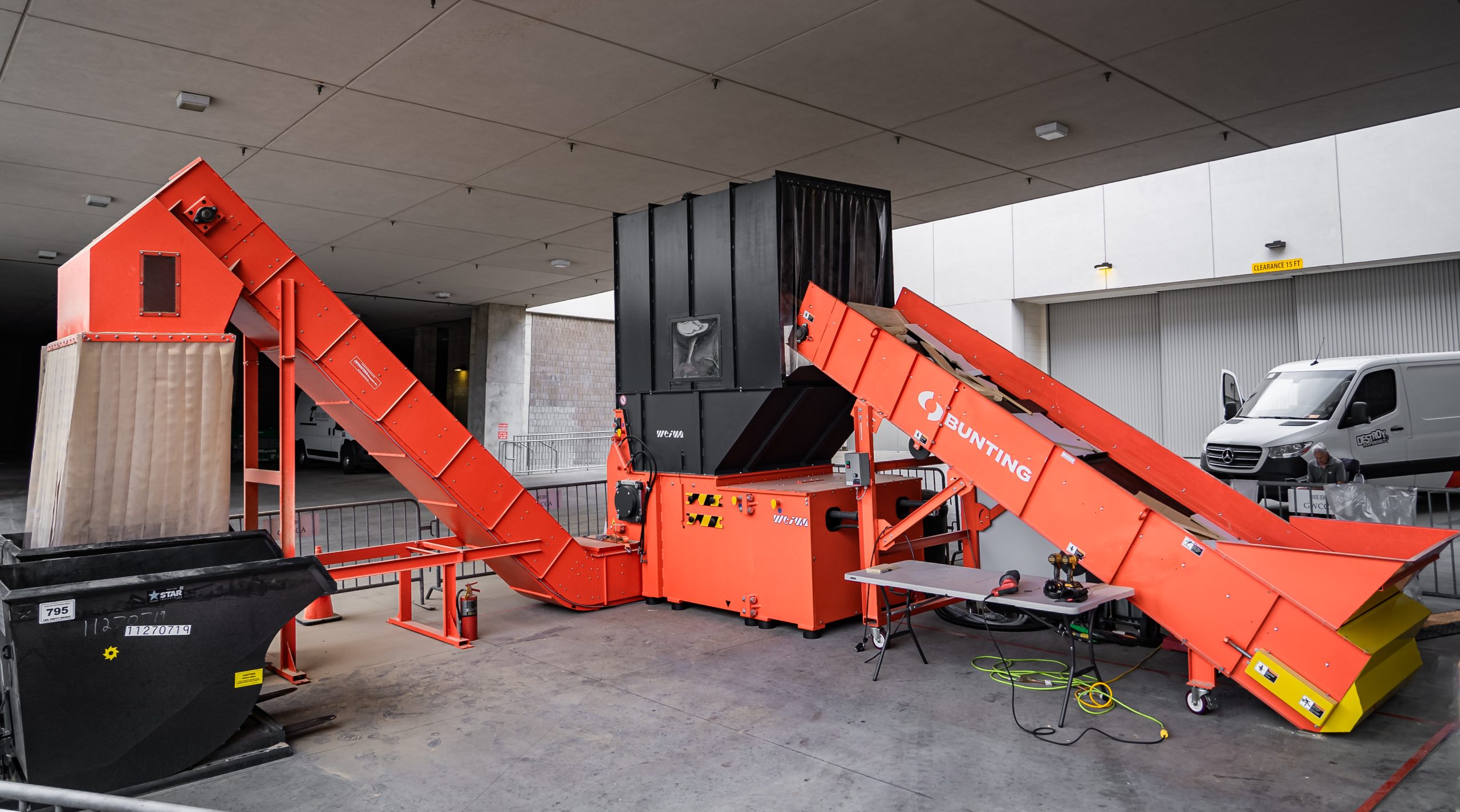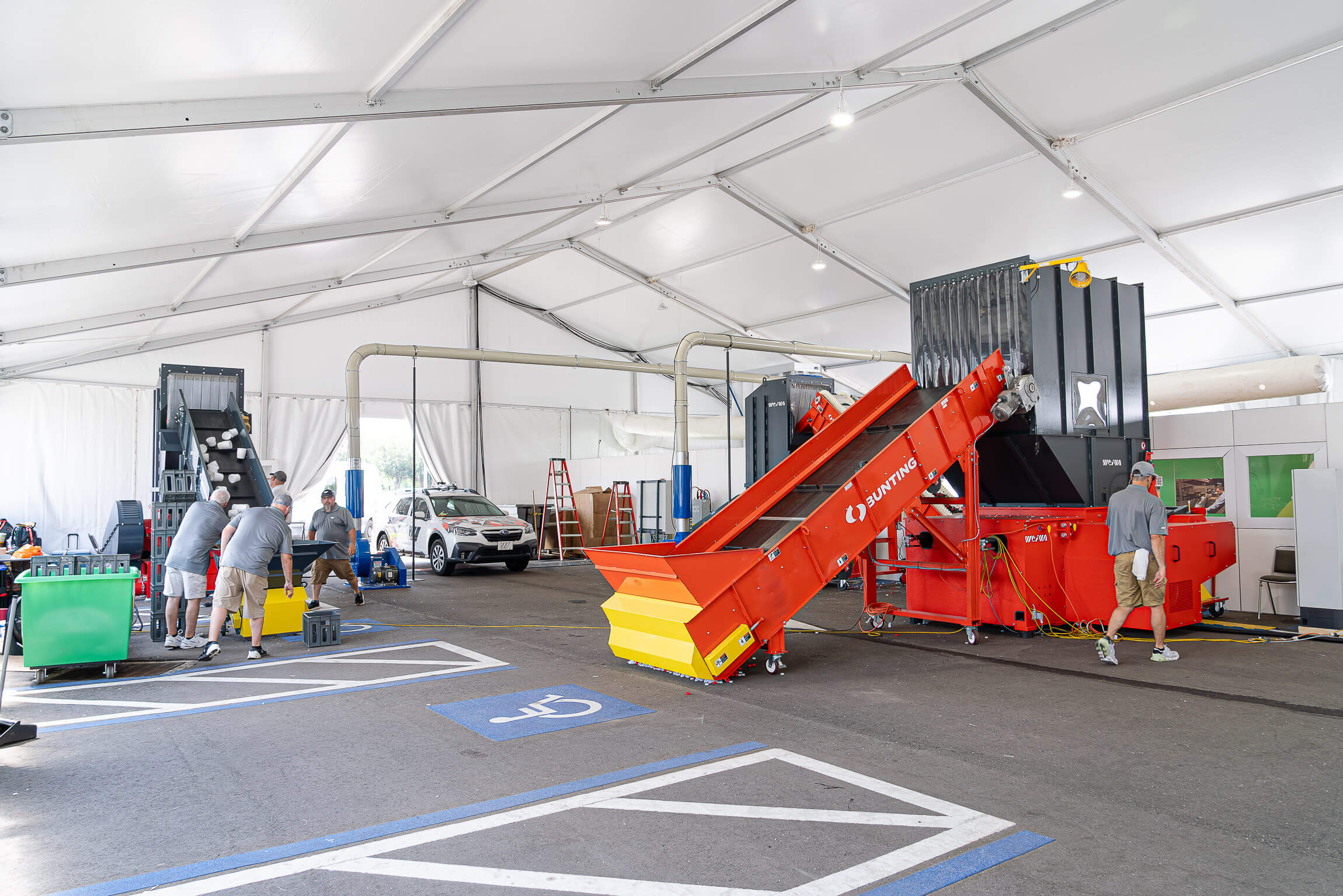 The Destroy Responsibly™ program is not just for the wood industry. Plastics industry events benefit from on-site recycling technology as well! In 2018, WEIMA partnered with PLASTICS, Freeman, and Commercial Plastics Recycling to initiate the program at NPE: The Plastics Show. A WEIMA WLK 13 single-shaft shredder was installed behind the tradeshow hall in Orlando and was running throughout the show’s duration. The shredder was part of a two-stage system, meaning it was connected by conveyors to a granulator and air system for proper size reduction. Once the granulate was created, Commercial Plastics Recycling was able to take it to their facility to be processed and sold as post-consumer resin. This resin is used to make new products that we use every day, giving what would traditionally be considered trash a second life.