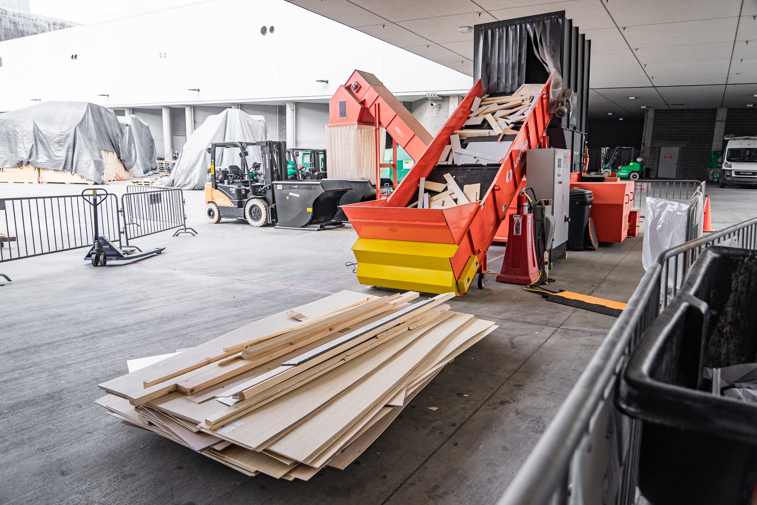 The shredded wood from the tradeshow floor is loaded into a dumpster for delivery to UNLV.
