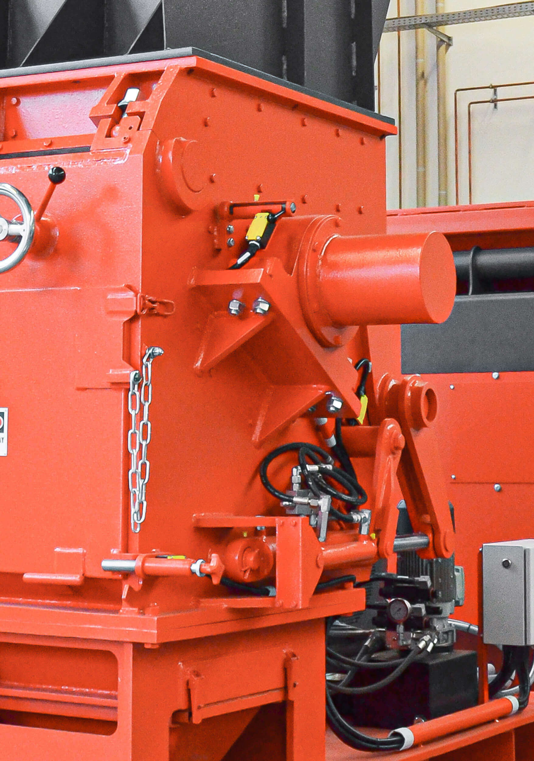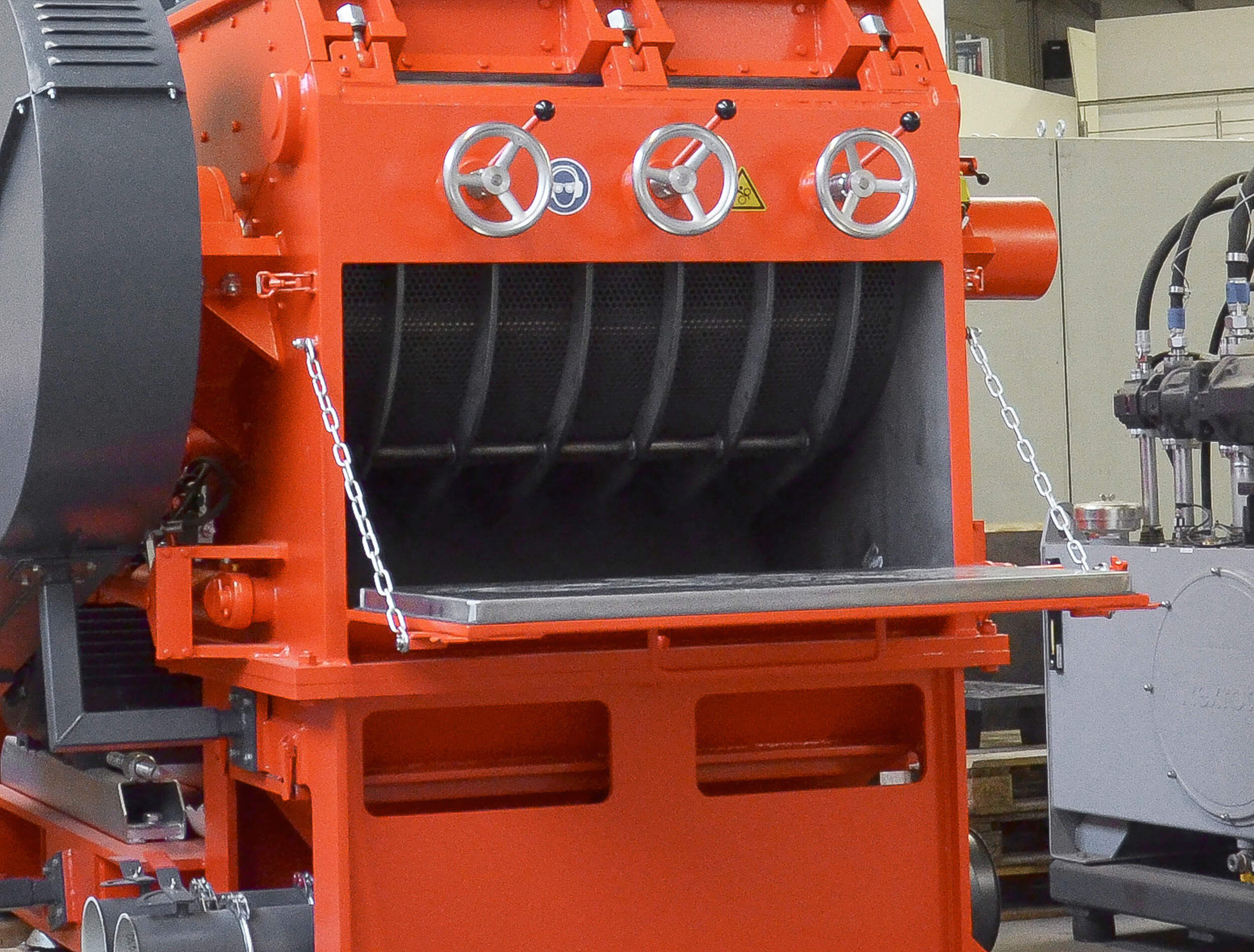 For maintenance and servicing work, the entire hopper can be swung away using a tilting mechanism. An integrated safety limit switch ensures the necessary personal protection. Once opened, there is clear and convenient access to the rotor, which significantly reduces maintenance times.