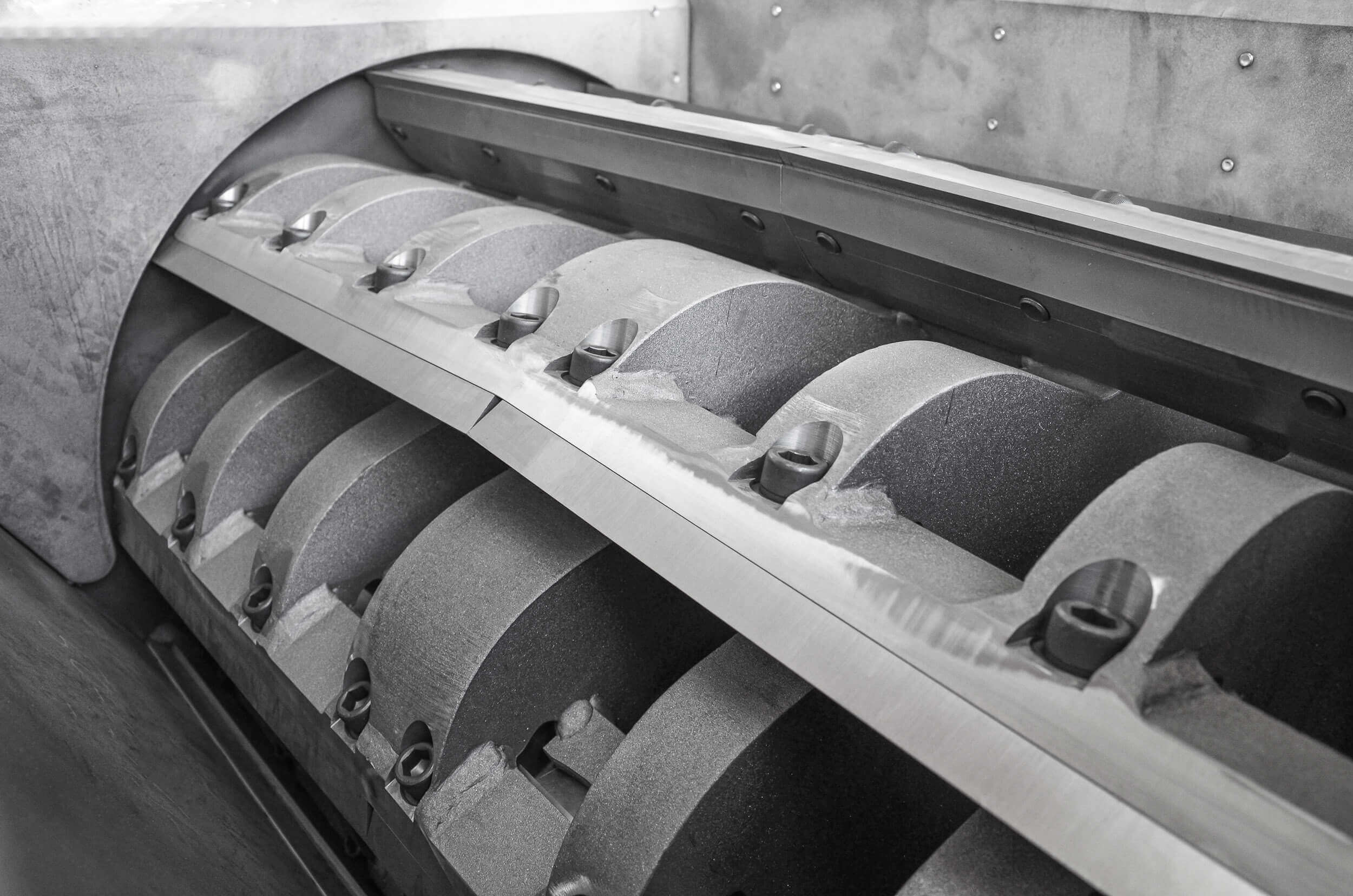 The cutting geometry is the central component of a secondary shredder and is crucial for efficiency and the quality of the shredded material. To ensure that the cutting gap is always optimally adapted to the material being processed, the cutting blades can be precisely adjusted outside the machine using an adjustment gauge.