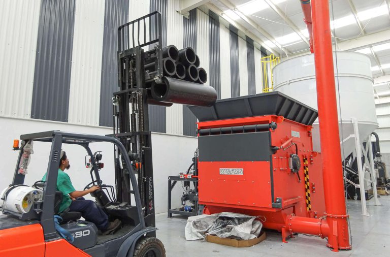 In the extrusion process in particular, HDPE plastic waste is regularly produced during startup and run-in of the systems – namely plastic lumps, also known as purgings. In addition, produced pipe segments or pipe spools may not meet the manufacturer’s quality requirements and therefore have to be recycled in-house.
